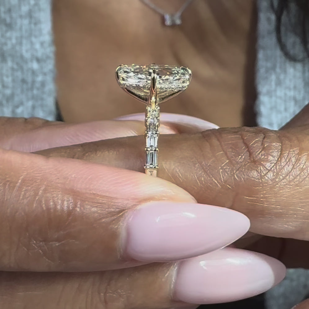 This Diamondboi signature design is a custom-made that went viral Lozenge cut lab-grown diamond engagement ring featuring straight baguettes on the shank and rotated prongs. Each ring is handcrafted to order in your choice of 18KT White Gold, Yellow Gold, or Rose Gold, offering a premium and personalized experience from start to finish.