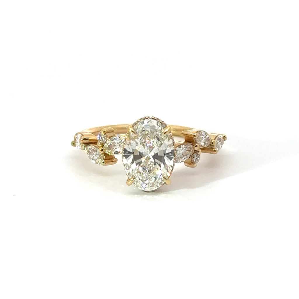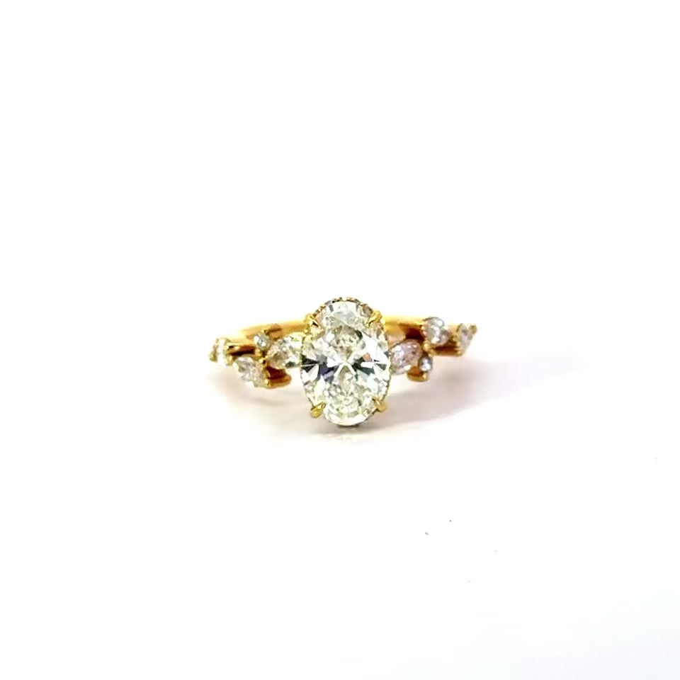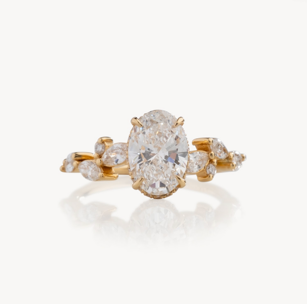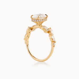 This Diamondboi signature design is a custom-made oval lab-grown diamond engagement ring featuring a modern reverse halo and a vintage marquise / round half-eternity shank. Each ring is handcrafted to order in your choice of 18KT White Gold, Yellow Gold, or Rose Gold, offering a premium and personalized experience from start to finish.