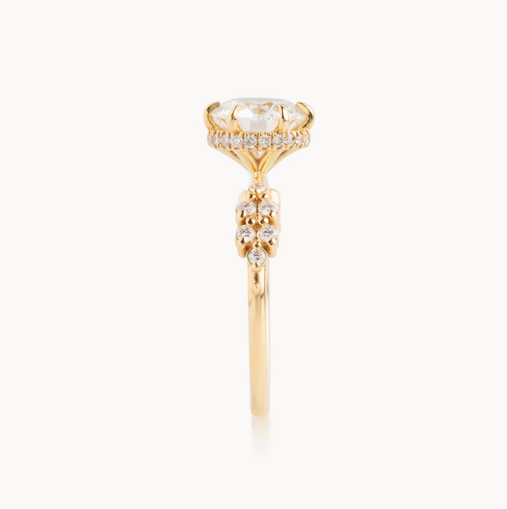 This Diamondboi signature design is a custom-made Round cut lab-grown diamond engagement ring featuring a cluster diamond shank and wrap-around reverse halo. Each ring is handcrafted to order in your choice of 18KT White Gold, Yellow Gold, or Rose Gold, offering a premium and personalized experience from start to finish.
