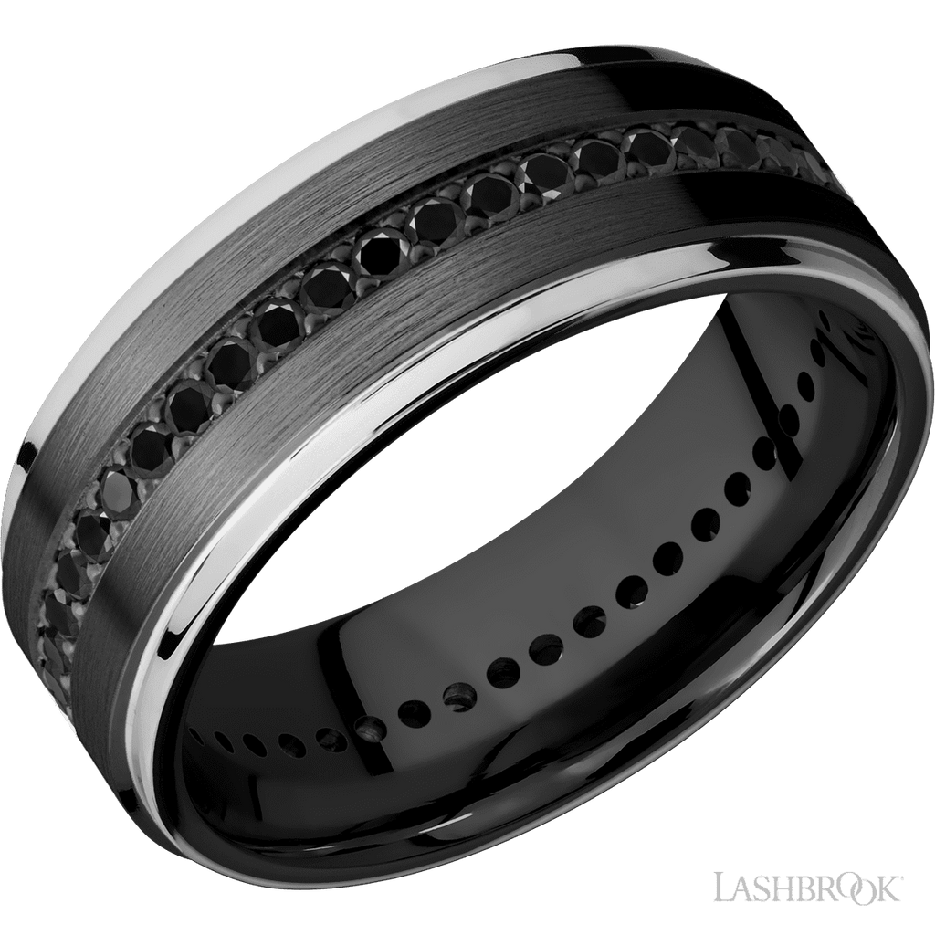 Men's 8MM Step Cut Design with Black Diamonds and Choice of Rose Gold, Yellow Gold or White Gold Edges- Choice of Zirconium